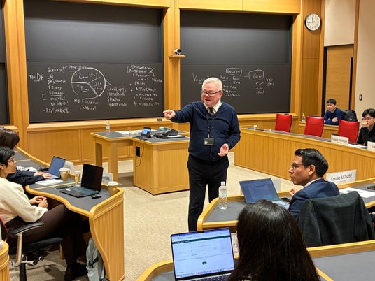 英語コースの締めくくりとして、2026年1月23日に「振り返り」を実施しました。この「振り返り」日にも、「M-KOPA Solar:Using Digital Disruption to Connect the World's Poor」や他の2つのケース教材をもとに、11月に受講した集中講義後、約2か月の期間に、参加者が集中講義で学修したことをいかに自身の業務に反映させることができたか、自分事とすることができたかなどについて、クラスディスカッションを通して共有しました。