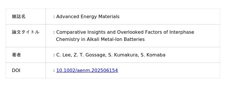 本総説論文を執筆したLee助教は、「ナトリウムイオン電池やカリウムイオン電池は次世代二次電池として期待されていますが、SEIやCEIについては誤った理解が多く存在し、界面反応の重要性も過小評価されてきました。そこで本論文では、界面層に関する新たな定義を提示しました。これにより、アルカリイオン電池の界面反応の抜本的な改善が加速し、ブレークスルーの創出に寄与することが期待されます」と本論文の意義についてコメントしています。