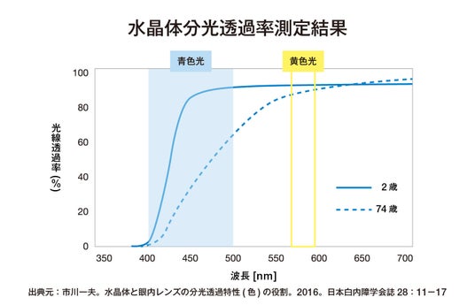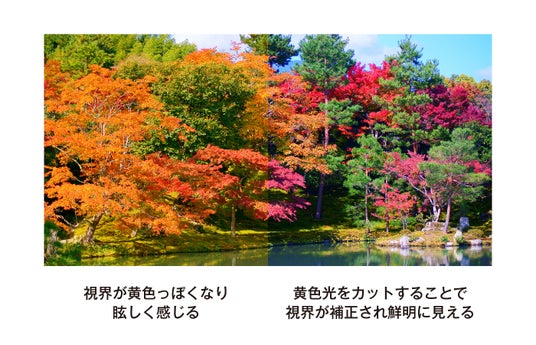 ハイコントラストレンズは、まぶしさの原因となるイエローライト(黄色光)をピンポイントでカット。明るさを損うことなく、鮮やかでクリアな視界を保ちます。見た目は濃度40%ながら、濃度60%相当の防眩効果を発揮するのが特徴です。さらに、黄色い光を効果的にカットすることで、加齢による水晶体の黄変によって黄色く着色した視界を補正。黄色光を強く感じることで見えにくくなっていた赤や緑といった色のコントラストが際立ち、食べ物や紅葉などの色合いをよい鮮やかに感じられます。また、本やタブレットの文字がくっきりと読みやすくなるなど、日常のさまざまなシーンで効果が期待できます。加えて、紫外線から短波長の可視光線までを吸収するUV420機能により紫外線を100%カットするなど、目を守りながら快適な視界を提供します。※