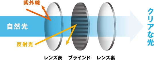 レンズの中に偏光フィルムを入れることで反射光をカットし、スッキリした視界を実現します。