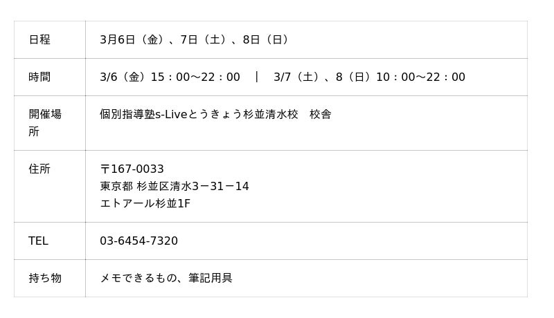 個別指導塾s-Liveとうきょう杉並清水校 入塾説明会の詳細