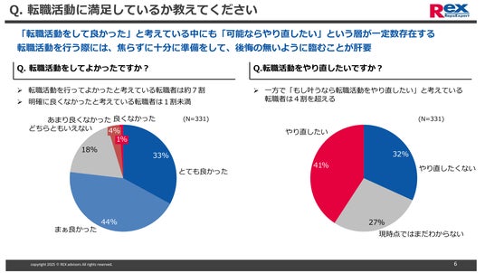- 可能なら転職活動をやり直したいと考えている転職者は4割以上。「転職活動をして良かった」と答えた転職者の中にも「やり直したい」層は一定数存在する