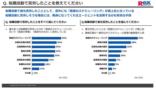 - 転職活動において最も苦労したことにおいても、応募先選定(25%)、スケジューリング(20%)、(書類作成16%)、面接準備(11%)で全体の7割を占める