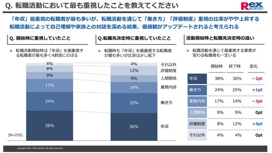 - 転職活動開始時には38%の転職者が年収を最重視しているが、転職先決定時には36%と微減、他にも業務内容は当初の17%から転職先決定時の14%に下がる