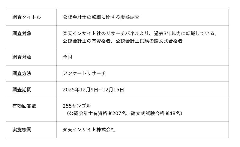 公認会計士・税理士・経理人材に特化した転職サポートを行う株式会社レックスアドバイザーズ(https://www.career-adv.jp/)は、「公認会計士の転職実態に関する調査」を行い、255名(公認会計士207名、論文式合格者48名)の有効サンプルを集計しました。なお調査にあたっては楽天インサイト株式会社(https://insight.rakuten.co.jp/)のアンケートパネルを活用しております。