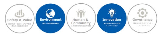 商船三井グループでは、グループビジョンの実現を通じて社会と共に持続的な発展を目指すための重要課題として「サステナビリティ課題(マテリアリティ)」を特定しています。本件は、5つのサステナビリティ課題の中でも特に「Environment -海洋・地球環境の保全-」、「Innovation -海の技術を進化させるイノベーション-」にあたる取り組みです。