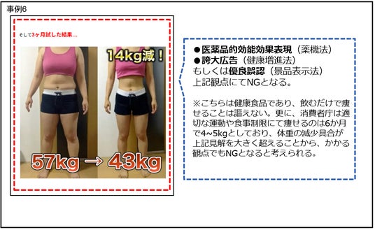 例:必ず痩せることができる、脂肪便を排出させる、代謝を上げてくれる、脂肪を燃焼させる、痩せ体質になれる、2週間で13.1kgの減量、BA画像との組み合わせで過度に痩せるような表現