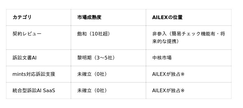 AILEXは飽和した契約レビュー市場(LegalOn Technologies・MNTSQ・GVA TECH等10社超が参入済み)を避け、以下の未開拓市場で先行者優位の確立を目指しています。