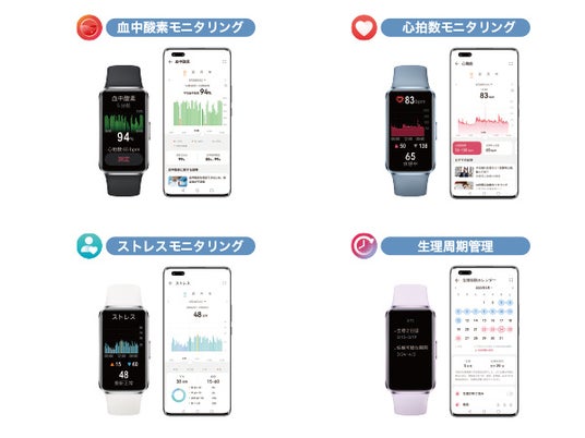 そのほか、血中酸素モニタリング、心拍数モニタリング、ストレスモニタリング、生理周期トラッキングなど健康管理に役立つ機能を搭載しています。HUAWEI Healthアプリはもちろん、Android、iOSに対応しており※4、総合的な健康モニタリングデータを一目で確認できます。アプリ内の「トレンド」という項目から過去30日間や数週間における平均の歩数や運動量、活動カロリー、睡眠時間、安静時心拍数、血中酸素レベル、ストレスレベルなどの変化を一目で確認できます。