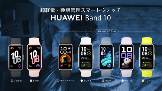 華為技術日本株式会社(ファーウェイ・ジャパン)は、薄型軽量で一日中快適な着け心地と、より専門的な睡眠モニタリングを実現したスマートウォッチ『HUAWEI Band 10 Aluminum Edition』と『HUAWEI Band 10』を、4月10日(木)より発売します。アルミ合金製ウォッチケースの『HUAWEI Band 10 Aluminum Edition』は、フルオロエラストマーベルトのマットブラック・ホワイト・ブルー・パープル・グリーンの5色を市場想定価格8,580円(税込)で販売します。また、従来モデルと同様のプラスチック製ウォッチケース『HUAWEI Band 10』は、フルオロエラストマーベルトのブラック・ピンクの2色を市場想定価格6,800円(税込)で販売します。