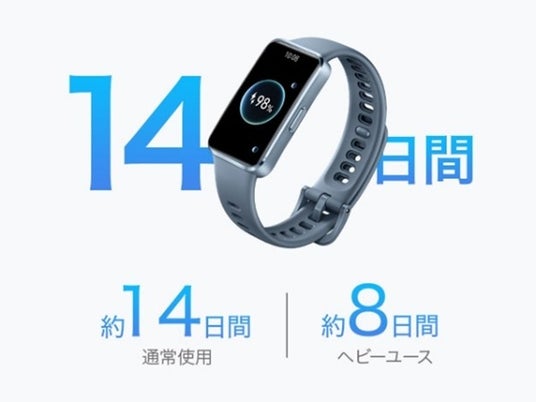 ※1:データはファーウェイラボによります。製品の個体差、使用方法、環境によって異なる場合があります。通常使用とは、スマートウォッチをスマートフォンとペアリングし、心拍数モニタリングを有効化、睡眠モニタリングを無効化。毎週30分間ワークアウト、メッセージ通知を有効化(1日平均50メッセージ、電話6回、アラーム3回)、1日に200回画面点灯をした場合です。ヘビーユースとは、心拍数モニタリング・睡眠モニタリング・血中酸素レベルモニタリング・ストレスモニタリングを有効化、毎週60分間ワークアウト、メッセージ通知を有効化(1日平均50メッセージ、電話6回、アラーム3回)、1日に500回画面点灯をした場合です。