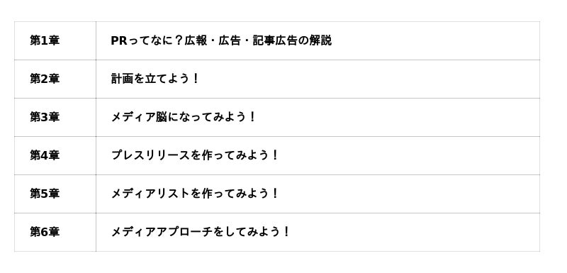 - 中小企業向け広報PR広報講座「メディチャン」で得られること。・広告ではない、メディア取材の獲得による認知拡大・自社の企画や戦略の立案の方法・自社のサービスや商品の言語化による正確な発信力・プレスリリースによる有効な情報発信の方法・メディアとのコミュニケーションの取り方・取材の受け方/イベント開催方法・メディア紹介