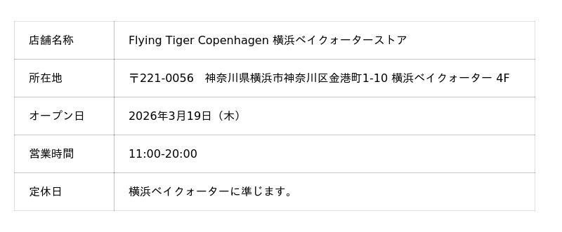 この度フライングタイガーは、 2026年3月19日(木)に、神奈川県横浜市の商業施設「横浜ベイクォーター」の4階に、神奈川県内8店舗目のストアをオープンします。今回、横浜駅きた東口直結とアクセスしやすいロケーションへの出店を通して、近隣のお客様にフライングタイガーらしい楽しいショッピング・エクスペリエンスをご提供していきます。