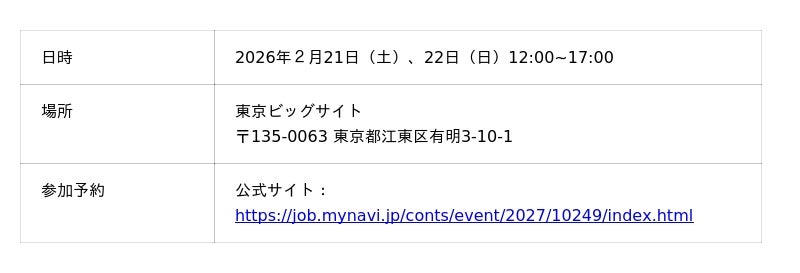 アルティウスリンク株式会社(所在地:東京都渋谷区、代表取締役社長:那谷 雅敏、以下 アルティウスリンク)は、東京ビッグサイトで開催される「マイナビ就活直前EXPO」に2月21日(土)はITスペシャリスト職、22日(日)は基幹職(総合職)のブースを出展します。本イベントは、2日間で約700社が出展し、企業理解を深めながら就活準備を一気に進められる合同説明会です。会場には、就活準備に役立つコンテンツや3月の就活解禁に向けたポイントなどもご紹介しています。学生の皆様のご参加をお待ちしております。