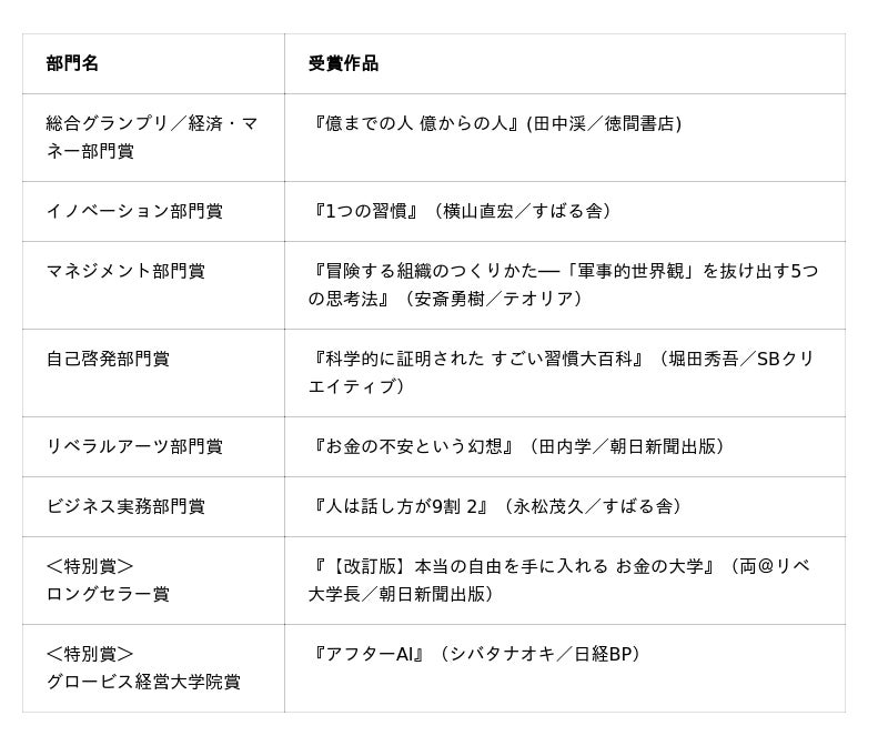 一般読者からのウェブ投票により、この度、総合グランプリと6つの部門賞(イノベーション部門、マネジメント部門、経済・マネー部門、自己啓発部門、リベラルアーツ部門、ビジネス実務部門)、特別賞「ロングセラー賞」、およびグロービス経営大学院選出の特別賞「グロービス経営大学院賞」の各賞の受賞作品が決定しました(投票数は非公開)。