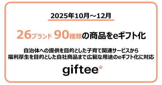 eギフトプラットフォーム事業(※1)を展開する株式会社ギフティ(本社:東京都品川区/代表取締役:太田 睦、鈴木 達哉/以下、ギフティ)は、2025年10月~12月の期間に、新たに26ブランド90種類の商品をeギフト化し、ギフティが運営するWEBサービスおよびスマートフォン向けアプリ「giftee(R)︎」(※2)、eギフトを活用した法人向けサービス「giftee for Business」(※3)および各ブランドの販売ページにて販売を開始したことを2026年2月12日(木)に発表いたします。