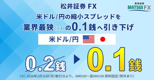 松井証券株式会社(本社:東京都千代田区、代表取締役 社長執行役員:和里田 聰、以下「当社」)は、2026年2月16日(月)取引分より、外国為替証拠金取引(FX)において、米ドル/円の縮小スプレッドを「0.2銭」から業界最狭(※1)の「0.1銭」に引き下げることをお知らせいたします。