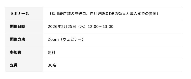 オンラインセミナー『採用難店舗の突破口、自社経験者DBの効果と導入までの裏側』を開催