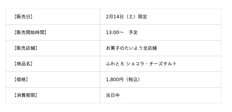 株式会社太陽社(所在地:千葉県匝瑳市飯倉293、代表取締役:片岡正裕)が展開する、千葉県で長年愛され続ける菓子店「お菓子のたいよう」では、バレンタインスイーツのラストを飾る第3弾として、『ふわとろショコラ・チーズタルト』を、バレンタイン当日の2026年2月14日(土)13:00より、1日限定で販売いたします。
