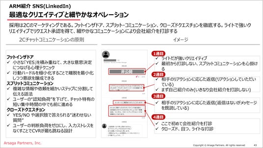 さらに、実際のコミュニケーションにおいては、チャットでの一言一言に至るまでトークスクリプトレベルで整理し、誰が対応しても同じ判断と行動が取れる状態を構築します。リファラルで突出した成果を出している人の振る舞いを分解・言語化し、その行動を全従業員が再現できるようにすることで、属人的な状態を排した運用を実現しています。