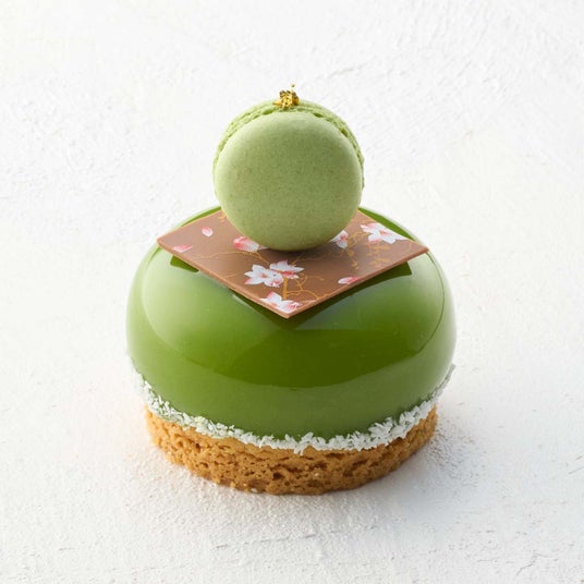 桃の節句のひな人形をイメージした抹茶のムース。宇治抹茶のムースで瀬戸内レモンのジュレ、宇治抹茶のガナッシュを包みました。