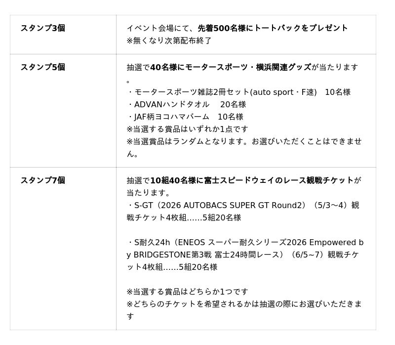 ※いずれの賞品もモータースポーツジャパン会場(山下ふ頭)のスタンプ獲得が必須条件となります。