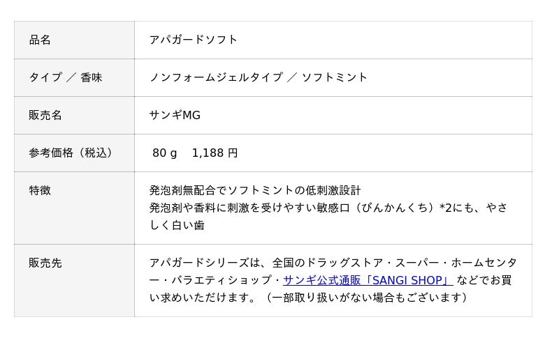 中でも今回入賞した「アパガードソフト」は、この薬用成分を含み、発泡剤無配合でみずみずしいノンフォームジェルタイプ。ソフトミントでやさしい使用感の低刺激設計が特長で、発泡剤や香料に刺激を受けやすい敏感口(びんかんくち)*2の方にもおすすめです。