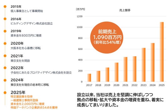 2015年に個人事業主として創業以来、私たちは「現場管理」を原点に成長を続け、2025年期には売上高10億9,000万円(前期比54%増)を達成いたしました。この節目に、東京・大阪の2本社体制をより盤石なものとし、次の10年に向けた新たな企業ブランドの確立を目指します。