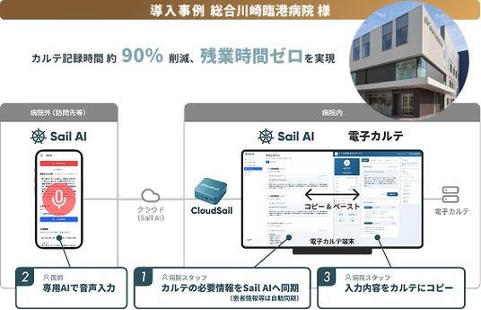 神奈川県の総合川崎臨港病院様では、訪問診療部門において「Sail AI」を先行導入いただきました。また、今回はオンプレミス環境の制約がある中でも、まずは小さく運用を開始できるよう、当社が提供するクラウドDX基盤「CloudSail」※2 を介し、クラウドサービス活用の導線を確保し、訪問診療部門に合った形で運用を開始しました。
