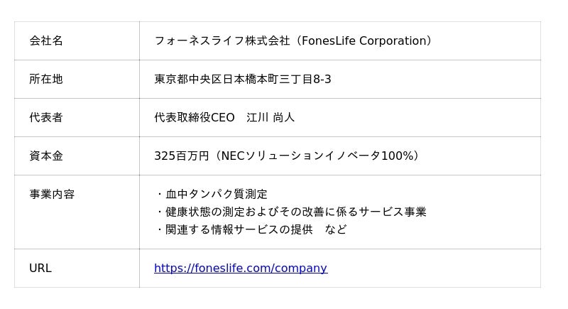 フォーネスライフは、デジタル技術でヘルスケア領域にソリューションを提供するNECソリューションイノベータが100%出資する会社です。米国 SomaLogic社の血中タンパク質測定技術と、NECグループのビッグデータ解析・先端ICTを用い、認知症などの将来の疾病リスク予測に基づく、一人ひとりに適した生活習慣の改善提案を行うことで、“誰も病気にならない未来”、“誰もが自分らしく生きられる社会”の実現を目指しています。