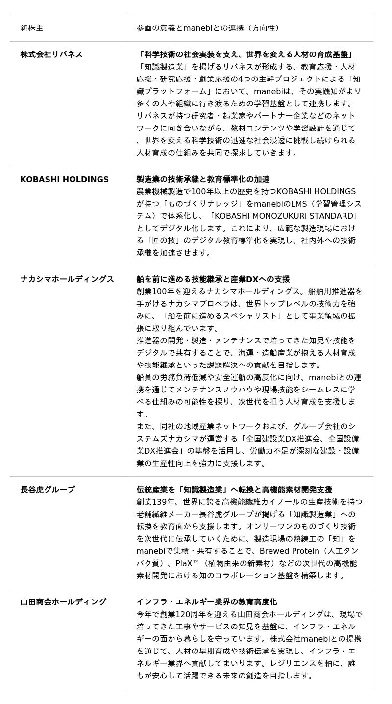 この度、manebiの持続的な成長と、日本の産業界におけるDX(デジタルトランスフォーメーション)および技能継承の加速を目的として、株式会社リバネス、KOBASHI HOLDINGS株式会社、ナカシマホールディングス株式会社、長谷虎グループ、株式会社山田商会ホールディングの5社を新たな戦略的株主として迎え、セカンダリー取引による資本提携を実施したことをお知らせいたします 。