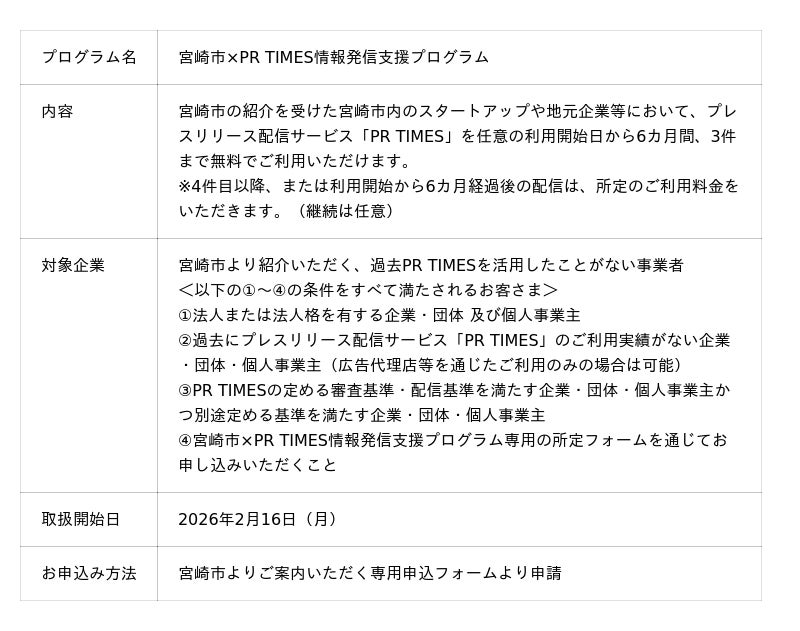 宮崎市が紹介する対象企業に対し、本来有償のPR TIMESでのプレスリリース配信を一定期間、一定枠を無償で提供します。全国のメディアや生活者へ情報を届けることで、認知を広げるきっかけとなります。