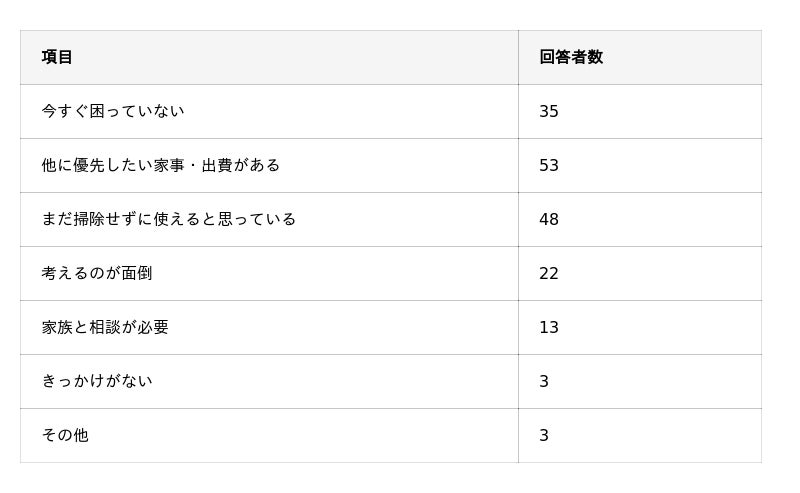- 後回しの理由で多いものは「他に優先すべき家事・出費がある」「まだ掃除せずに使えると思っている」。