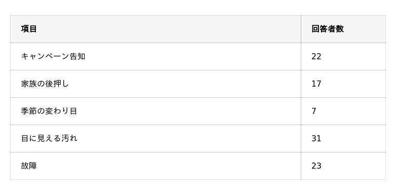 - エアコンクリーニングをまだしなくても大丈夫と思う理由は「冷暖房が効いている」から。