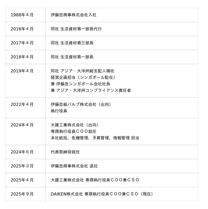DAIKEN株式会社(大阪市北区、社長:億田正則)は、本日開催の取締役会において、下記のとおり、社長を交代することについて決議いたしましたので、お知らせいたします。