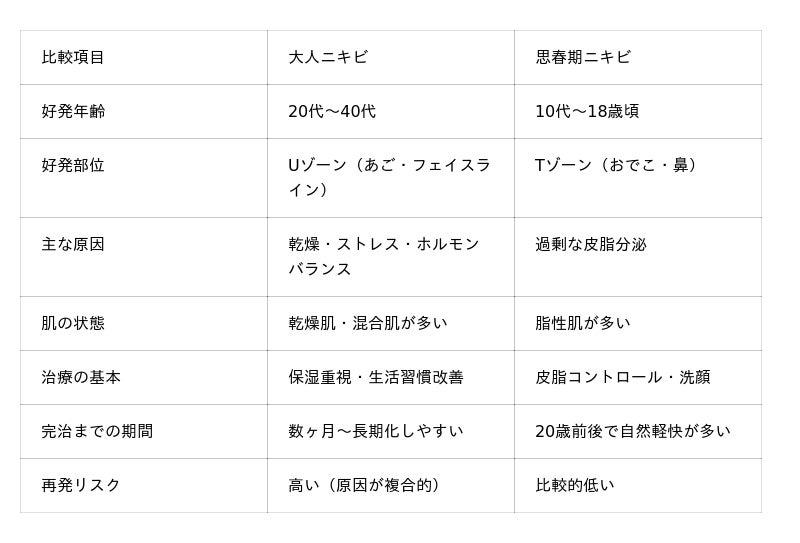 結論から言うと、大人ニキビと思春期ニキビは原因が根本的に異なるため、治療法も変える必要があります。思春期ニキビは過剰な皮脂分泌が主因でTゾーンにできやすいのに対し、大人ニキビはホルモンバランスの乱れや乾燥、ストレスが原因でUゾーン(あご・フェイスライン)にできやすいのが特徴です。30代でニキビが治らない方は、10代向けの皮脂対策ケアを続けていることが悪化の原因となっている可能性があります。