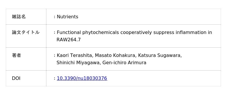 本研究成果は、慢性的な炎症を基盤とする生活習慣病の予防や進行抑制を、日常の食生活から支援できる可能性を示しています。本研究で見出された植物由来成分の相乗作用を応用することで、少量でも高い機能性を発揮する食品、サプリメント、調味料、香辛料などの開発が期待されます。これは過剰摂取の回避やコスト低減にもつながり、誰もが日常的に取り入れやすい健康維持法の実現に貢献します。また、天然由来成分を活用する安全性や持続可能性の高いヘルスケア技術として、健康寿命の延伸や医療費抑制への貢献が期待されます。