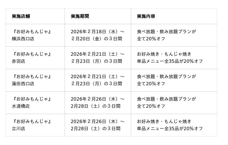 東京都内と横浜市で5店舗を展開する、出汁(だし)にこだわったお好み焼き・もんじゃ焼きがコスパ良く楽しめる『お好みもんじゃ』(運営:株式会社大庄)は、各店の節目を祝い全店にて「まとめて周年祭」イベントを開催します。2026年2月、横浜西口店がオープン15周年を迎えたほか、立川店、蒲田西口店、水道橋店、赤羽店の4店舗が1周年を迎えました。これを記念して、横浜西口店・蒲田西口店・水道橋店の3店舗で、お好み焼き・もんじゃ焼きの食べ飲み放題の全プランを20%オフ。赤羽店・立川店の2店舗で、お好み焼き・もんじゃ焼き単品メニュー全35品を20%オフで提供するイベントを、この2月中に各店3日間限定で実施します(各店舗の実施日は後述)。
