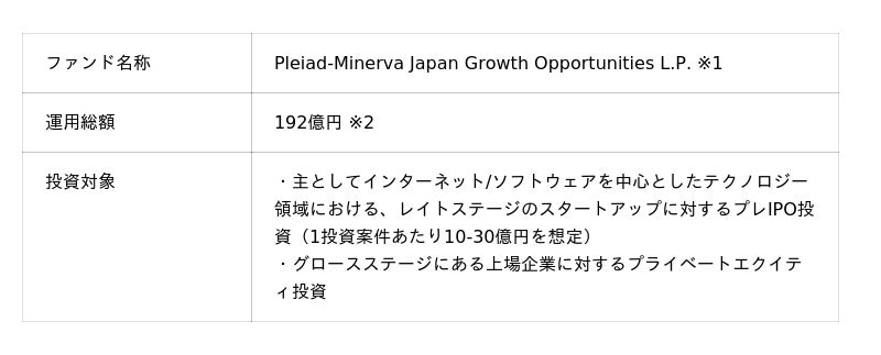 ※1 本ファンドは、金融商品取引法第63条に基づき適格機関投資家等特例業務に関する特例の適用を受けて、基本的にはいわゆるプロ投資家を相手に運営されるファンドです。本プレスリリースは、適格機関投資家及びファンドの投資先候補となる企業の皆様への情報提供を目的として作成されたものであり、金融商品取引法に基づく開示資料ではなく、また、本ファンドへの買付けの申込みを勧誘・推奨するものではありません。