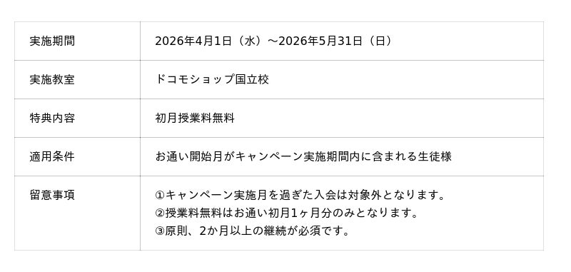 国立校のオープンを記念し、初期費用を抑えて学習を始められる特別なキャンペーンを実施します。