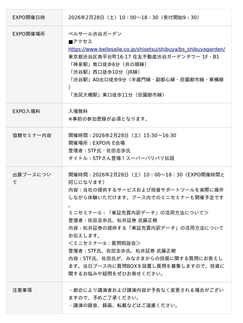 松井証券株式会社(本社:東京都千代田区、代表取締役 社長執行役員:和里田 聰、以下「当社」)は、2026年2月28日(土)に「ベルサール渋谷ガーデン」にて開催される、パンローリング株式会社主催の日本最大級の個人投資家向けイベント「投資戦略フェア EXPO2026」(以下「投資戦略フェアEXPO」)へセミナー協賛およびブース出展いたします。