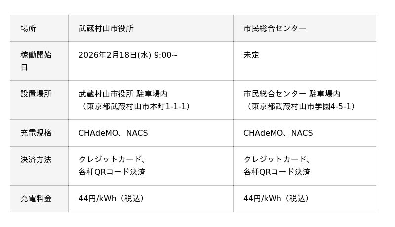 本導入により、来庁者への利便性向上を図るとともに、武蔵村山市が推進するカーボンニュートラルの実現に向けたインフラ整備に貢献してまいります。