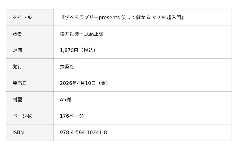松井証券株式会社(本社:東京都千代田区、代表取締役 社長執行役員:和里田 聰、以下「当社」)は、当社YouTubeチャンネルの人気コンテンツ「資産運用!学べるラブリー」初の書籍が、株式会社扶桑社(本社:東京都港区、代表取締役社長:秋尾 弘史、以下「扶桑社」)より2026年4月10日(金)に発売されることをお知らせいたします。