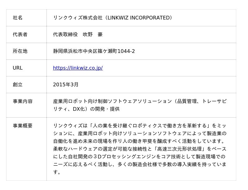 リンクウィズは「人の業を受け継ぐロボティクスで働き方を革新する」をコーポレートミッションとして、製造業の集積地である静岡県浜松市にて創業しました。リンクウィズは2015年の創業以来、自社ミッションの達成の為、また創業の地である静岡県浜松市が誇る製造業、特に輸送機器産業を進化させるべく活動してきました。これまで生産をより正確に、より効率化をさせる生産最適化システム「L-ROBOT」、人が苦手とする検査領域をロボティクス技術でサポートする自動検査システム「L-QUALIFY」、それらの生産データを収集、分析、提案を実行する生産データ管理分析ツール「LINKWIZ FACTORY CLOUD」をリリースしており、これらを輸送機器産業、農機・建機製造業、建築、建材製造業、プラントエンジニアリング分野などで展開してきました。これらの事業の更なる推進を図るため、本ラウンドは以下を目的としております。