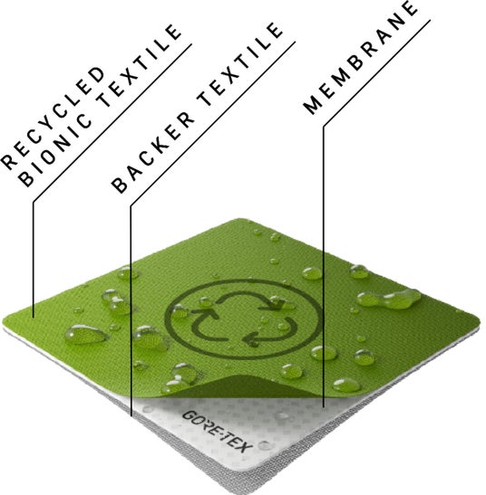 BIONIC社のリサイクル生地を用いたGORE‑TEX ラミネートは、厳格なテストにより、厳しいGORE-TEX ブランドの品質と耐久性基準をクリアしています。