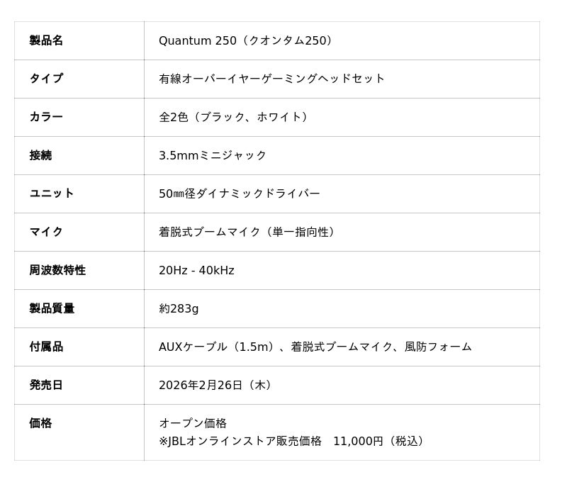 ハーマンインターナショナル株式会社(本社:東京都千代田区、代表取締役:桑原拓磨)は、アメリカ カリフォルニア発祥の世界最大級のオーディオブランド「JBL」が手掛けるゲーミング用デバイス「JBL Quantum(クオンタム)」シリーズの新モデルとして、「JBL Quantum 950 WIRELESS」「JBL Quantum 650 WIRELESS」「JBL Quantum 250」を2026年2月26日(木)に発売いたします。