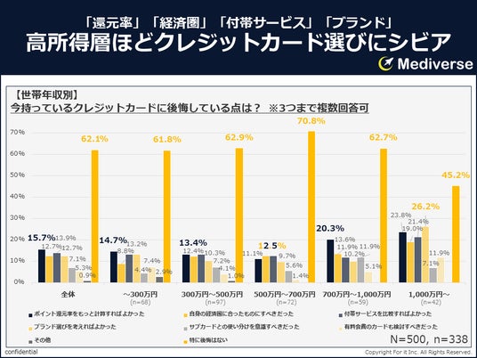 しかし、カードを選んだ後の「今のカードに後悔している点」では、利用経験により評価軸が変化しており、高年齢・高所得層は満足度が最も高い一方で、付帯サービスやブランド、上位カードへの関心が高まっており、機能面だけでなく質的価値も求める傾向が見受けられました。