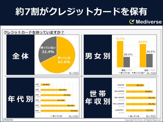 全国18歳以上の男女500名に対して、クレジットカード保有率を聞いたところ、全体の約7割(67.6%)が保有していることがわかった。