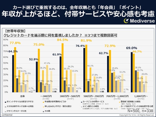 世帯年収別に見ると、カード選びの際に重視したことには、年収による違いが見られた。