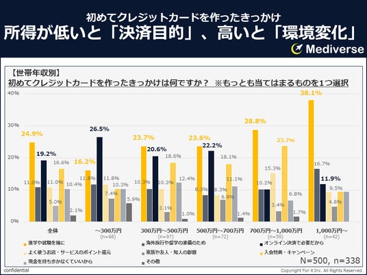 世帯年収別に見ると、初めてクレジットカードを作ったきっかけには、年収による違いが見られた。